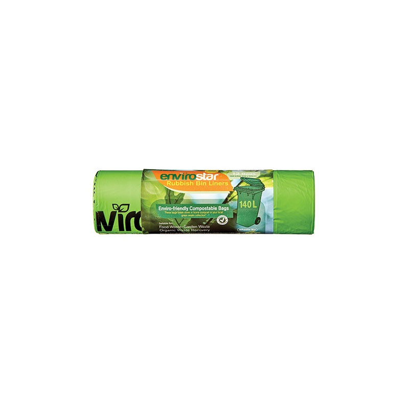 140L Compostable 23um green bin liners are made from natural plant material. They are ideal for everyday use and efficient removal of garbage and trash. Envirostar bin liners will disintergrate within 90 days in correct composting conditions. These bin liners can be composted in both home and suitably equipped council or commercial composting facilities.