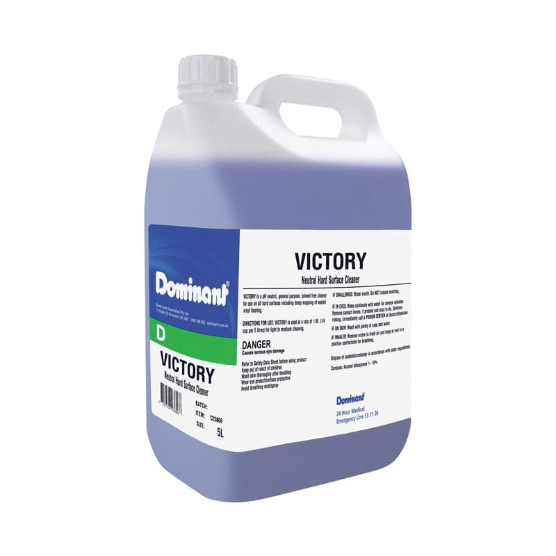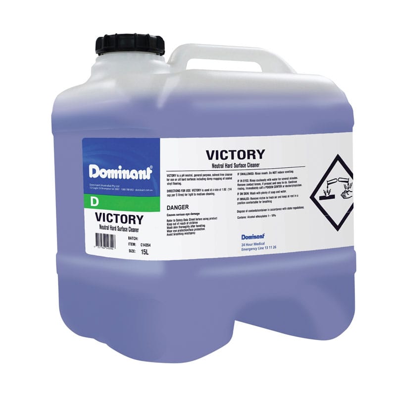 Victory is a pH neutral, general purpose, solvent free cleaner for use on all hard surfaces including damp mopping of sealed vinyl floors.