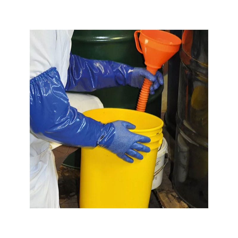 This is a full-length nitrile coated chemical glove with an elastic end to hold the glove in place. This glove has fitted hand sizes for increased dexterity and a rough-textured palm for maximum grip. This is a flexible glove that will absorb perspiration and allow your workers a tactile feel and better grip.