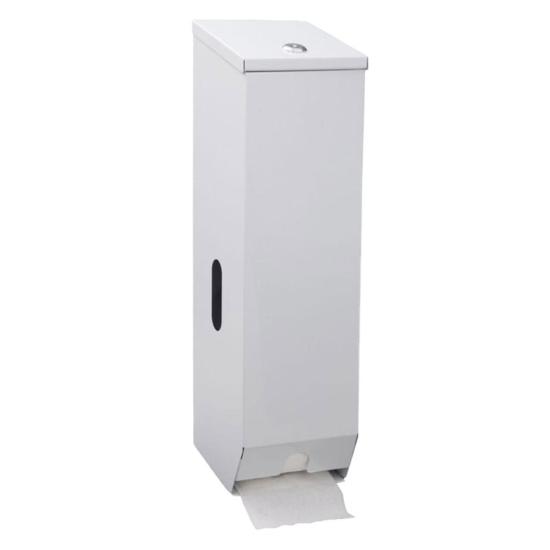 Triple metal toilet roll dispenser. Lightweight and hygienically designed this unit is stylish and compact and has the added features of being key lockable and impact resistant.